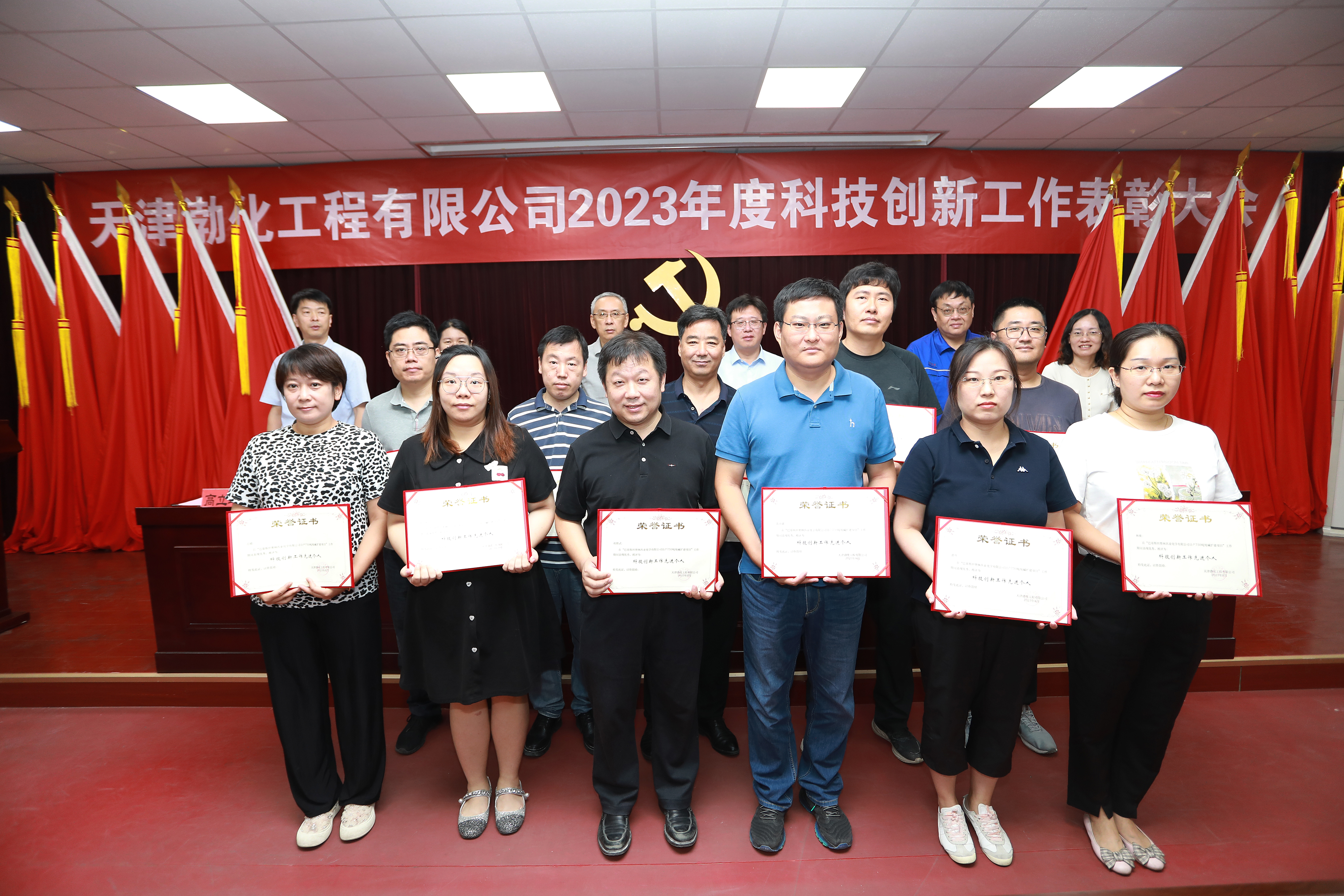 公司黨委副書記高立軍宣讀了《關(guān)于表彰2023年度優(yōu)秀科技創(chuàng)新集體的決定》,獲得2023年度中國(guó)石油和化工勘察設(shè)計(jì)協(xié)會(huì)“優(yōu)秀工程設(shè)計(jì)項(xiàng)目”獎(jiǎng)項(xiàng)的“中泰化學(xué)吐魯番市托克遜縣高性能樹脂產(chǎn)業(yè)園及配套基礎(chǔ)設(shè)施建設(shè)項(xiàng)目-年產(chǎn)10萬噸糊樹脂裝置”等三個(gè)項(xiàng)目集體、2022年度天津市優(yōu)秀咨詢成果獎(jiǎng)的“濟(jì)源市金祥材料有限公司年產(chǎn)6萬噸微懸浮法糊樹脂項(xiàng)目可行性研究報(bào)告”項(xiàng)目集體、年度優(yōu)秀設(shè)計(jì)項(xiàng)目濱州大有10萬噸/年碳四綜合利用項(xiàng)目集體、丙烯醇、乙烯法氯乙烯、微懸浮法糊樹脂年度優(yōu)秀技術(shù)開發(fā)課題組代表,以及發(fā)明專利“一種重灰工藝生產(chǎn)系統(tǒng)及其生產(chǎn)工藝”發(fā)明集體共9個(gè)科技創(chuàng)新集體、60余名科技創(chuàng)新人員先后上臺(tái)接受表彰。獲獎(jiǎng)人員代表、重點(diǎn)研發(fā)課題代表曹建新、劉薇薇、張學(xué)坤、胡小營(yíng)從各自從事的科技創(chuàng)新工作出發(fā)進(jìn)行了表態(tài)發(fā)言。