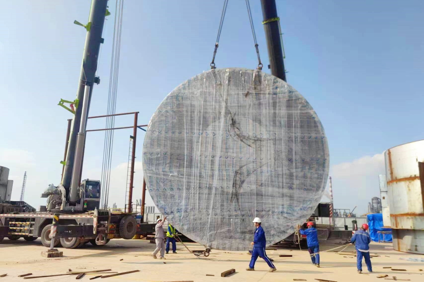 渤化工程是整個項目第一支正式進駐項目現(xiàn)場施工隊伍,項目團隊克服重重困難,完成與業(yè)主、與監(jiān)理單位、與特種設備監(jiān)檢機構對接,確定了現(xiàn)場制造設備的管理方式,建立了協(xié)調程序。渤化工程也是整個項目第一家大件運輸?shù)截泦挝?,運輸公司沒有本地協(xié)調能力,車輛遲遲不能出高速收費站。項目團隊為保證工期,放棄中秋假期,全力以赴協(xié)調溝通,對接運輸企業(yè)、對接慶陽同欣、對接路政執(zhí)法大隊、對接高速收費站、對接交警大隊等部門。最后在慶陽同欣和當?shù)卣块T的幫助下,管板、折流板運輸車輛順利抵達項目現(xiàn)場。管板、折流板的到達,標志著反應器現(xiàn)場制造的所有主體材料齊全,渤化工程反應器現(xiàn)場制造工作全面展開。面對現(xiàn)場困難項目團隊勠力同心、砥礪前行,以時不我待,只爭朝夕的精神,推進反應器的現(xiàn)場制造工作。確保安全生產無事故,保質、保量、保交付。